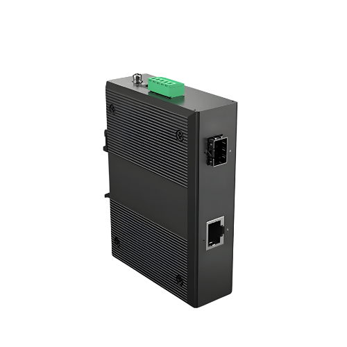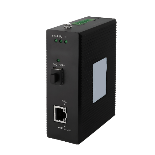 Specimen Track 10G Gigabit Fiber & Media Converter are the smallest industrial-grade 10G Ethernet media converter (from 10000 Base-X SFP+ to 10G or 5G or 2.5G or 1G or 100M Base-T Copper) with 802.3bt Power over Ethernet Plus Plus (PoE++) injector function to deliver up to 90 W of power output and high data transmission speed to PDs (powered devices) installed in a remote area where sufficient and reliable power input is required, providing non-blocking wire-speed performance and great flexibility for 10G Ethernet extension in harsh industrial environment. It is equipped with one 10G or 5G or 2.5G or 1G or 100M Base-T RJ45 copper interface and one 10G Base-X SFP+ fiber optic interface delivered in an IP40 rugged but compact sized strong case with redundant power system (44 V to 57 V DC).